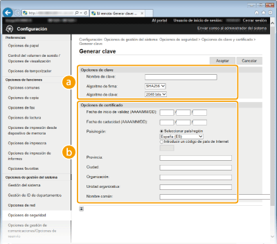 Los pares de claves pueden generarse con el equipo en caso necesario para la comunicación cifrada a través de la Capa de seguridad de transporte (Transport Layer Security, TLS). Puede utilizar TLS para acceder al equipo a través de la IU remota. Pueden registrarse hasta cinco pares de claves en el equipo.
