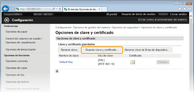 Los pares de claves no pueden eliminarse si se utilizan actualmente para algún fin, como cuando "[TLS]" o "[IEEE 802.1X]" aparecen en [Uso de clave]. En este caso, deshabilite la función o sustituya el par de claves antes de eliminarlo. El certificado de CA preinstalado no puede eliminarse.