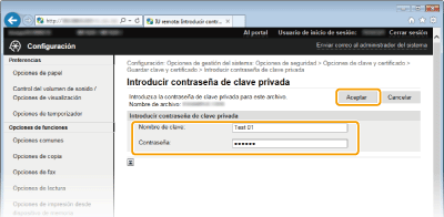 Introduzca el nombre del par de claves y la contraseña y, a continuación, haga clic en [Aceptar].