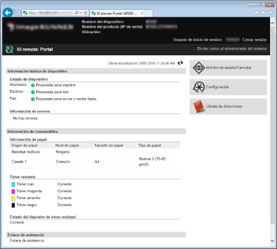 Puede realizar todas las operaciones y configuraciones de la IU remota. Introduzca el ID adecuado en [ID de administrador del sistema] y el PIN en [PIN admdor. sistema] (