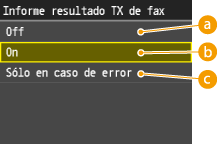 Seleccione esta opción para imprimir un informe resultado TX para fax o un informe resultado TX para archivo/e-mail sólo cuando se produzca un error de envío.