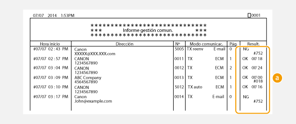 Cuando aparece un código de error). Para el e-mail, el Informe de gestión de comunicaciones indica el resultado de transmisión entre el equipo y el servidor de correo, no entre el equipo y la dirección de destino.