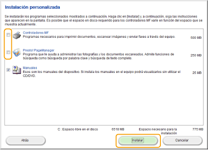 Desmarque todas las casillas de verificación excepto [Manuales], y haga clic en [Instalar].