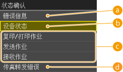 时,将显示可供检查正在打印、发送或接收的文档状态的画面,以及墨粉量等设备状态或本机 IP 地址等网络设置信息。