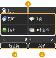 ![]() | 功能选择按钮轻触可激活复印、传真、扫描或 ID 卡复印功能。 <地址簿>轻触可显示地址簿中注册的接收方的列表。在地址簿中注册 <菜单>显示本机可用设置的菜单。设置菜单列表 |