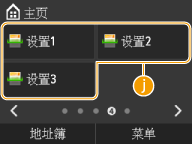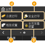 ![]() | <介质打印>显示用于指定存储介质打印的画面。 <安全打印>开始打印加密文档时轻触。打印通过 PIN 加密的文档(安全打印) <纸张设置>显示用于指定纸张设置的画面。装入纸张 <主页屏幕设置>显示用于自定义主画面的画面。自定义主画面 |
