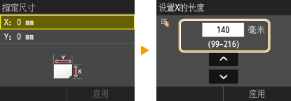 1 | 指定 <X>(短边)侧的长度。 轻触 <X>。 使用  /  输入 <X> 侧的长度,或使用数字键输入整数和分数,然后轻触 <应用>。 |