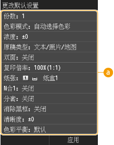 时所显示的设置即为默认设置。如果更改这些默认设置以符合您频繁执行的操作,可以省去每次复印时进行相同设置的麻烦。