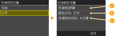 若要将已经接收的文档存入存储器,请将 <存储锁定设置> 设置为 <打开>。可以指定可选设置,例如安全设置,使解除锁定时需要密码;还有时间设置,用于指定一天中将接收到的文档存到存储器中的时间段。