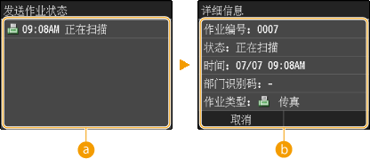 2 | 轻触您要检查状态的文档。 ![]() <发送作业状态>/<接收作业状态>显示正在发送和接收或等待处理文档的列表。 <详细信息>显示从列表选择的文档的详细信息。如果指定了多个接收方,画面上会显示指定接收方的数量。若要检查所指定的多个接收方的详细信息,请轻触 <接收方数量>。如果发现不需要的文档,请轻触 <取消> 或 <删除>,然后轻触 <是>。 |