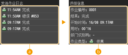 2 | 轻触您要检查日志的文档。 ![]() <发送作业日志>/<接收作业日志>显示已发送和已接收文档的列表。文档发送或接收成功时会显示 <完成>,文档发送或接收因取消或出现错误而失败时会显示 <错误>。 <详细信息>显示从列表选择的文档的详细信息。 ![]() 如果 <结果> 栏显示一个三位数 此数字表示错误代码。出现错误代码时 |
