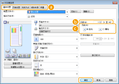 指定份数和打印方向等打印设置,然后单击 [确定]。