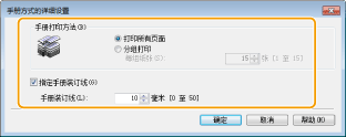 如果使用订书机或其他装订工具,请指定用于装订小册子的页边距宽度。选择 [指定手册装订线] 复选框,然后在 [手册装订线] 中指定页边距宽度。