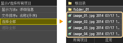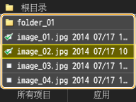 3 | 轻触 <JPEG/TIFF> 或 <PDF>。 会选择所有 JPEG/TIFF 或 PDF 格式文件。 如果在轻触 <所有项目> 之前选择了文件,则只能选择相同格式的文件。 |