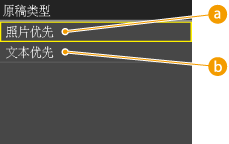可以根据要打印的图像选择原稿类型。轻触 <照片优先> 或 <文本优先>。