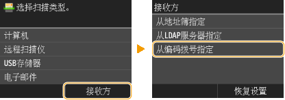 | | 使用地址簿,可以通过从注册的接收方列表中选择来指定接收方,或可以通过含接收人姓名的接收方名称进行搜索来指定接收方。也可以直接输入分配给接收方的三位数(编码拨号号码)指定接收方。 |