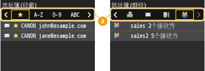 <全部>显示注册在地址簿中的所有接收方。有关接收方旁边的标志,请参阅以下说明。