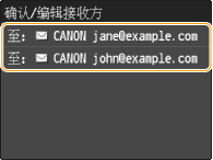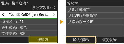 如果想要不显示接收方列表,简单且快速删除接收方在步骤 1 中轻触 <确认/编辑> 之前,可以轻触  /  切换已经指定的接收方。显示要删除的接收方,然后按  。 |