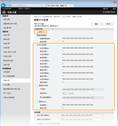 想要手动输入 IPv6 地址时,请选择此复选框,然后在对应的文本框中输入 IP 地址、前缀长度、默认路由器地址。