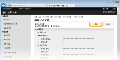确认设置是否正确确保通过使用本机的 IPv6 地址可以用您的计算机显示远程用户界面画面。 启动远程用户界面使用操作面板也可从 <菜单> 访问 IPv6 设置。 IPv6设置 |