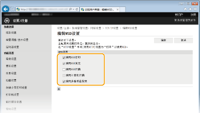 2 | 根据需要配置设置。 ![]() [使用WSD打印] 选择此复选框可通过 WSD 打印。不使用 WSD 打印时,请取消选择此复选框。 [使用WSD浏览] 选择此复选框可通过 WSD 从计算机获取关于本机的信息。当选择 [使用 WSD 打印] 复选框时,将自动选择此复选框。 [使用WSD扫描] 适用于 Windows Vista/7/8/8.1,WSD 扫描可将文档扫描到计算机,而无需安装扫描仪驱动程序。选择此复选框可通过 WSD 扫描文档。不使用 WSD 扫描时,请取消选择此复选框。 [使用计算机扫描] 选择此复选框可通过用操作面板操作本机来使用 WSD 扫描。只有选择 [使用 WSD 扫描] 复选框后,才能选择此复选框。若要执行扫描,请轻触 <扫描>,并指定作为扫描目的地的计算机(从本机扫描)。 [使用多路传送发现] 选择此复选框可将本机设置为回复多路传送发现讯息。如果取消选择此复选框,即使多路传送发现讯息在网络上传播,本机也将保持睡眠模式。 |