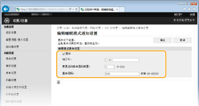 2 | 选择 [通知] 复选框,并指定所需设置。 ![]() [通知] 选择此复选框可通知设备管理软件本机的电源状态。当选择 [通知] 时,可以使本机在睡眠模式期间避免不必要的通信,并降低总耗电量。 [端口号] 根据网络环境更改用于此功能的端口号。 [要通过的路由器的数量] 指定通知数据包可以通过的路由器数量。输入 0 至 254 之间的数字。 [通知间隔] 指定本机通知设备管理软件其电源状态的频率。输入 60 至 65535 之间的秒数。 |