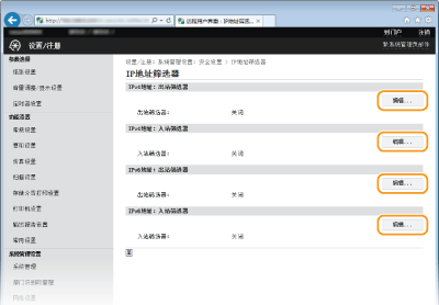 2 | 指定例外地址。 在 [要注册的地址] 文本框中输入 IP 地址(或 IP 地址范围),然后单击 [添加]。  检查是否有输入错误如果错误输入 IP 地址,则可能无法从远程用户界面访问本机,此时需要将 <IPv4地址筛选器> 或 <IPv6地址筛选器> 设置为 <关闭>。 IPv4地址筛选器 IPv6地址筛选器  IP 地址输入形式 | 说明 | 示例 | 输入单个地址 | IPv4: 用点分割数字。 | 192.168.0.10 | IPv6: 用冒号分割字母数字字符。 | fe80::10 | 指定地址范围 | 在地址之间插入连字符。 | 192.168.0.10-192.168.0.20 | 指定具有前缀的地址范围 | 输入地址,然后输入斜杠和表示前缀长度的数字。 | 192.168.0.32/27