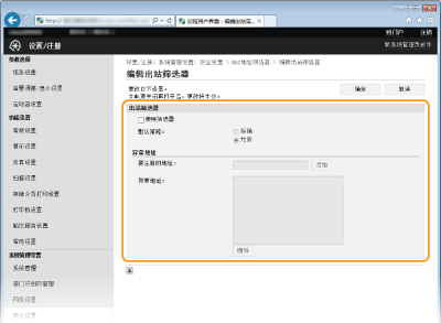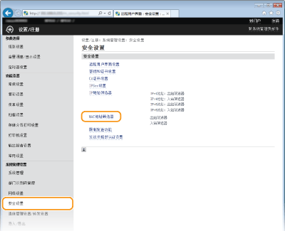 无需用连字符或冒号分割地址。  检查是否有输入错误如果错误输入 MAC 地址,则可能无法从远程用户界面访问本机,此时需要将 <MAC地址筛选器> 设置为 <关闭>。 MAC地址筛选器  当出站筛选器选择 [拒绝] 时