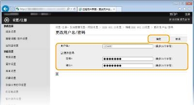3 | 设置用户名/密码,然后单击 [确定]。 [用户名] 为用户名输入最多 24 个字母数字字符。 [更改密码] 若要设置或更改密码,请选择此复选框并在 [密码] 和 [确认] 文本框中输入最多 24 个字母数字字符的新密码。 |
