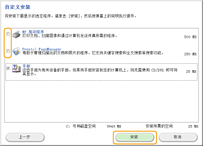 清除除了 [手册] 以外的所有复选框,然后单击 [安装]。