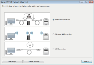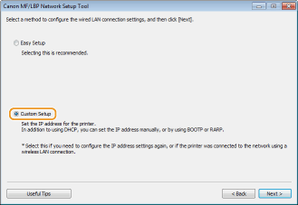 When switching the connection method from wireless LAN to wired LANYou need to uninstall the currently installed printer driver, configure the wired LAN connection, and then reinstall the printer driver. When configuring the wired LAN connection, select [Custom Setup] for the configuration method.