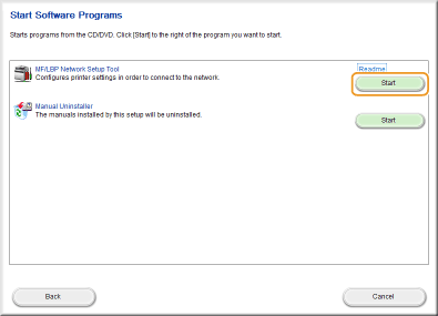 The MF/LBP Network Setup Tool is a utility that allows you to configure initial network settings by following instructions on the screen. The Tool starts automatically when you install a printer driver from the User Software CD-ROM/DVD-ROM. If you want to start it alone manually, you can start it from the User Software CD-ROM/DVD-ROM or start it directly from a file downloaded from the Canon website.