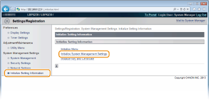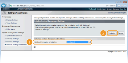 ) with an object such as a pen tip or thin pin, all of the settings in the [System Management Settings] menu (Setting Menu List) of the Remote UI are initialized at once. However, the [System Manager Name], [Device Name], and [Location] settings of [System Management] are not initialized.![]() |