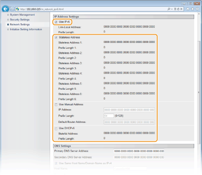 Use the Remote UI to set IPv6 addresses. Before setting IPv6 addresses, make sure that the IPv4 address has been set correctly (Viewing Network Settings). You can register up to nine of the following IPv6 addresses.