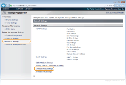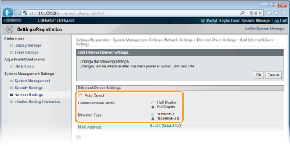 Ethernet is a standard for communicating data in a LAN. You can set the communication mode (Half Duplex/Full Duplex) and the Ethernet type (10BASE-T/100BASE-TX). The factory default setting, the communication mode and type of Ethernet are automatically detected. Usually, the Ethernet settings can be used as is, but use the following procedure to manually specify the settings as necessary.