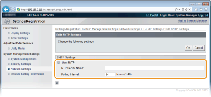 Simple Network Time Protocol (SNTP) enables you to adjust the system clock by using a time server on the network. When you use SNTP, the system checks the timer server periodically, so that the system clock is always accurate. The time is based on Coordinated Universal Time (UTC), so specify the time zone setting before configuring SNTP ( Timer Settings).