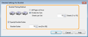 Select this setting when there are too many pages that they cannot be bound all at once. The number of sheets specified for [Sheets per Set] are allocated to a single set for printing. Fold the smaller sets, and then collect them to form a booklet.
