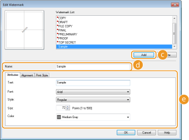 Click each tab to specify the text, color, or print position of the watermark name. For more information about the settings, click [Help] on the printer driver screen.