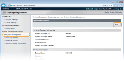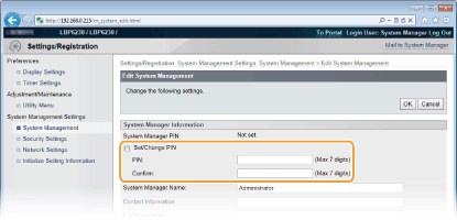Administrator access rights are required to change machine settings from the Remote UI. After logging in as an administrator, use the following procedure to set the PIN (system manager password). The system manager password is critical to the security of the machine. Make sure that only system managers know the system manager password.