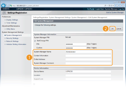 Enter the name and contact information of the system manager as necessary, and click [OK].
