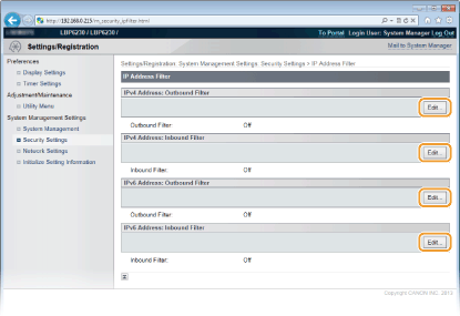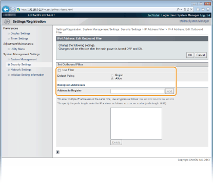 Enter an address, followed by a slash ("/") and a number indicating the prefix length (Examples: "192.168.0.32/27" "fe80::1234/64"). When [Reject] is selected for an outbound filter