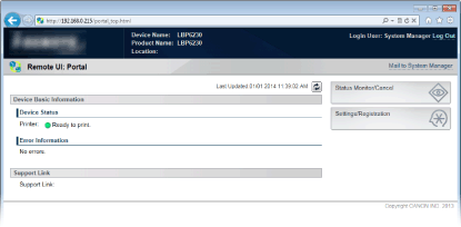The Portal Page (main page) of the Remote UI appears. Remote UI Screens