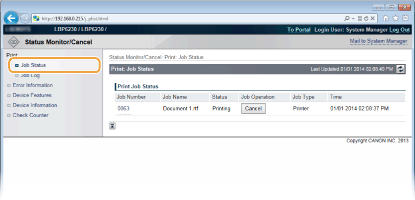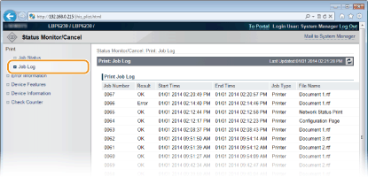 Click [Job Number] to display detailed information about a document. For example, you can check the user name and the print page count of the document.
