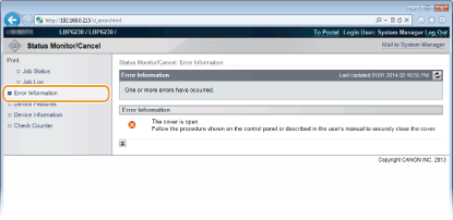 When an error occurs, you can display this page by clicking the message displayed under [Error Information] on the Portal Page (main page).