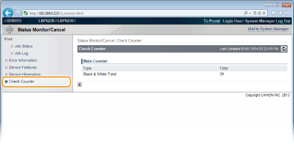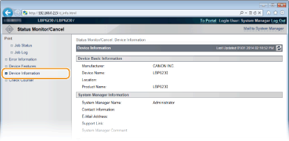 This page displays information about the machine and the system manager. This information is set in [System Management] on the [Settings/Registration] page (