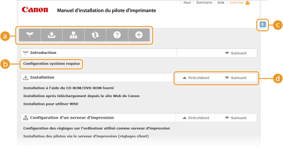 Les pages des rubriques comprennent des instructions sur l'installation des pilotes d'imprimante.