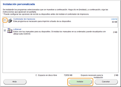 Marque la casilla de verificación de la impresora que desea instalar en la [Lista de impresoras].