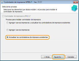 Seleccione [Actualizar los controladores de impresora existentes] y haga clic en [Siguiente].