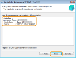 Compruebe la información de la impresora en [Lista de impresoras para la instalación del controlador] y haga clic en [Inicio].