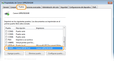 Si la [Descripción] del puerto seleccionado es [Canon MFNP Port], y el equipo y el ordenador tienen la misma subred, la conexión se mantendrá. No necesitará agregar un puerto nuevo. Si se trata de un [Standard TCP/IP Port], tendrá que agregar un puerto nuevo. Configuración de los puertos de la impresora